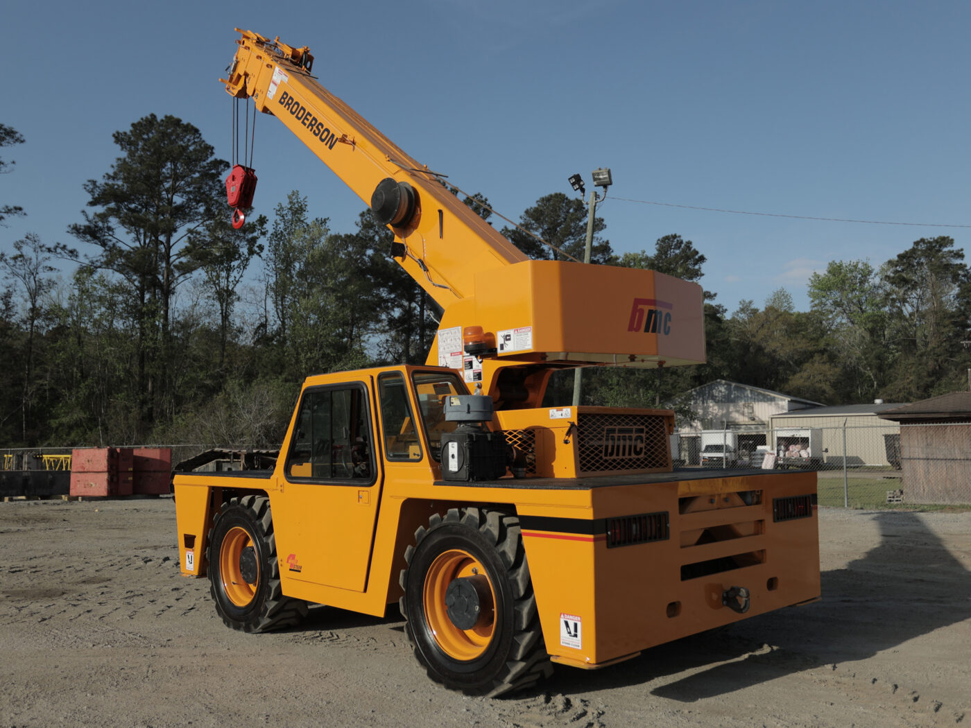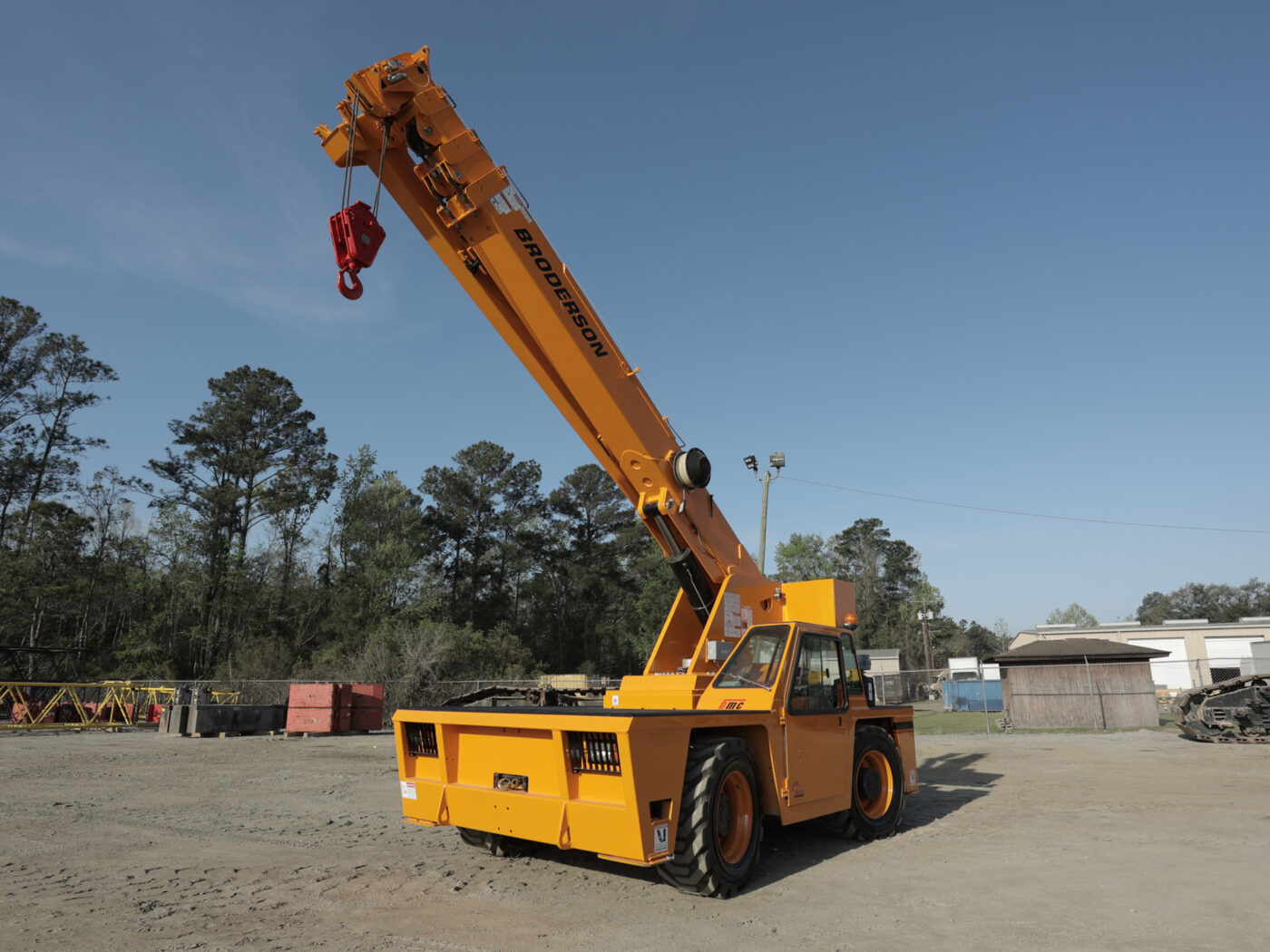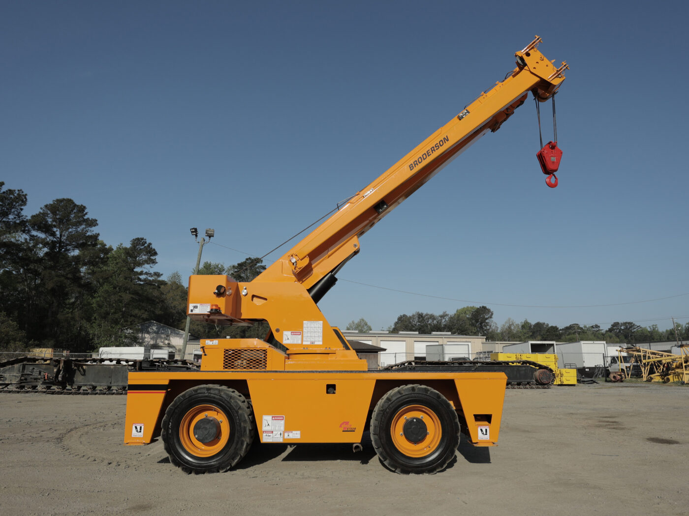 The Broderson IC-200-3H is a 15-ton capacity industrial carry deck crane, primarily valued for its compact size and versatility in maneuvering through constrained indoor and outdoor job sites. Its features include a four-section hydraulic boom, up to a 66-foot horizontal reach with an extension, and multiple steering modes like crab and four-wheel steer to enhance its impressive maneuverability.